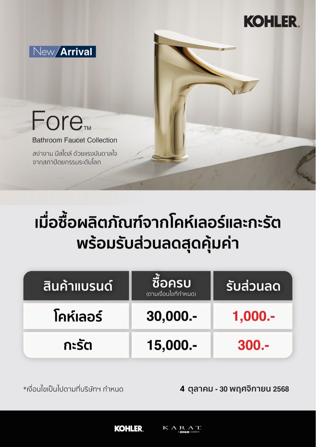 - ซื้อสินค้าโคห์เลอร์ครบ 30,000 บาทขึ้นไป รับส่วนลด 1,000 บาท