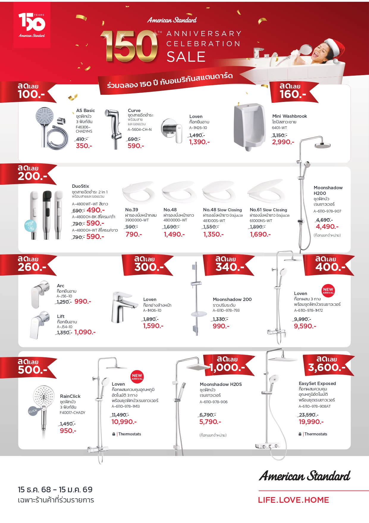 เฉพาะสินค้าแบรนด์อเมริกัน สแตนดาร์ด ทุกประเภท (ชุดเซ็ตสุขภัณฑ์ อ่างล้างหน้า อ่างอาบน้ำ แบรนด์ไอดีล ชุดเรนชาวเวอร์ ,ก๊อกน้ำ, และอุปกรณ์)