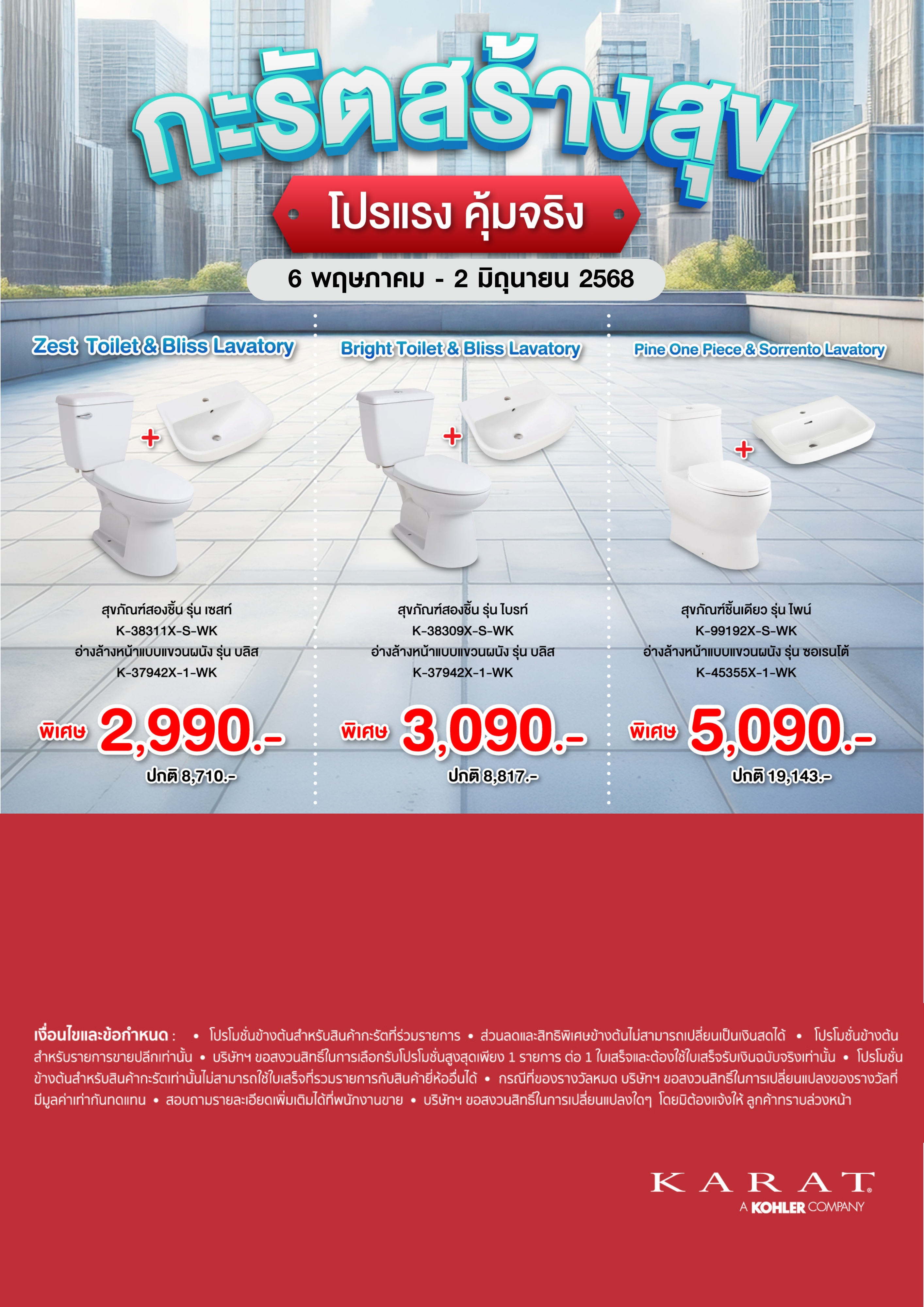 -สุขภัณฑ์สองชิ้น รุ่น เซสท์ K-38311X-S-WK + อ่างล้างหน้าแบบแขวนผนัง รุ่น บลิส K-37942X-1-WK ปกติ 8,710.- พิเศษ 2,990 บาท